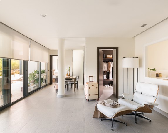 Residencia de dos dormitorios con salón-comedor y terraza con vistas a la piscina infinity de nado, repartida en una sola planta. Algunas de las Premium residencias le permiten disfrutar de jardines privados, de jacuzzi hidromasaje en la terraza y de bar/barbacoa para disfrutar aún más de la vida al aire libre que ofrece el clima mediterráneo